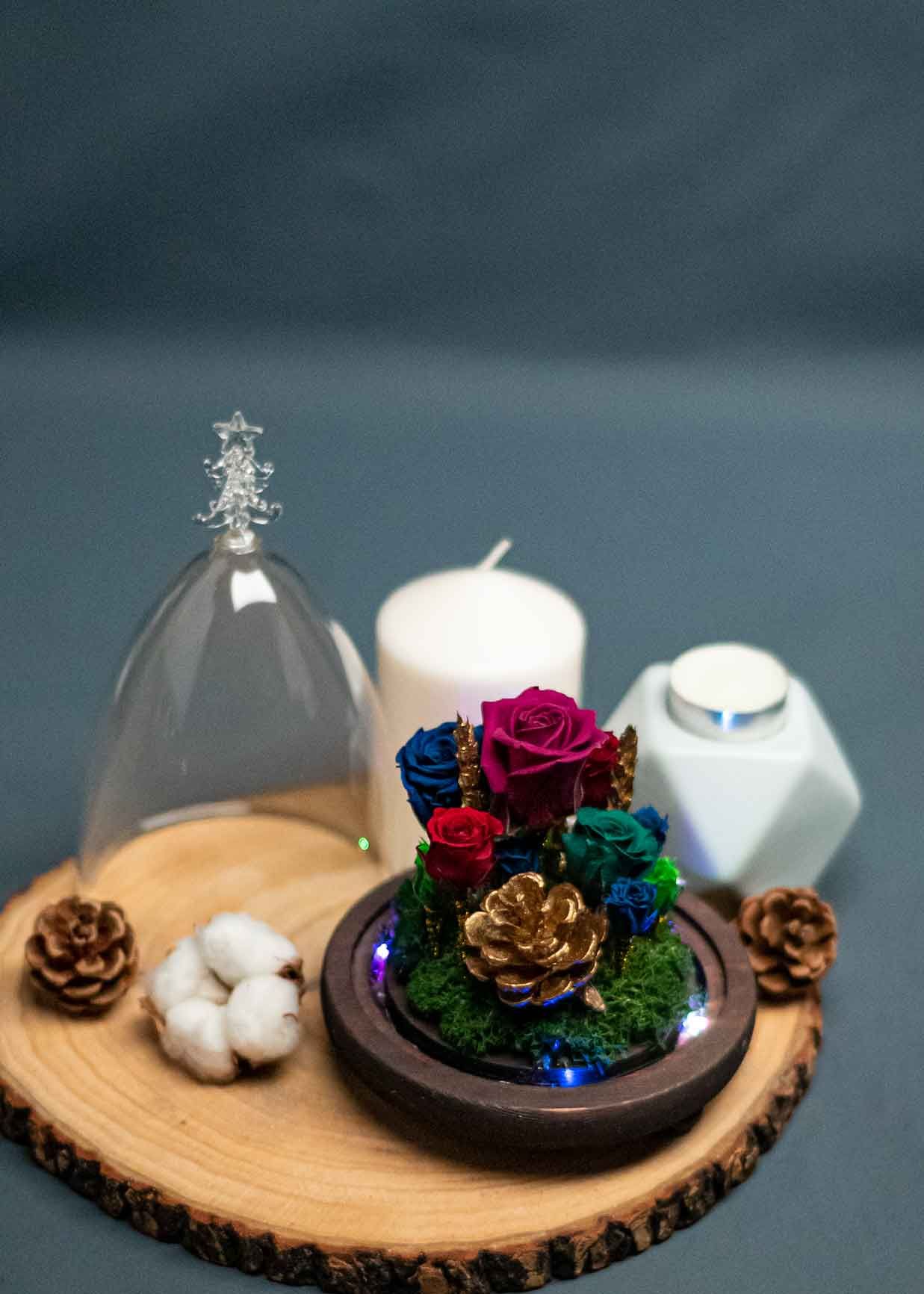 Feature flowers: Preserved Moss, Preserved Roses, Dried Shiny Flowers , Pine Cone